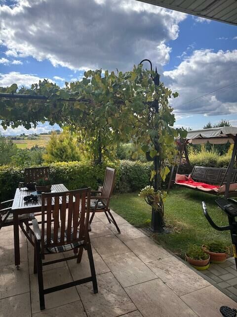 Taras duży, z altaną, wejście bezpośrednio z salonu. Podwyższony w stosunku do ogrodu.